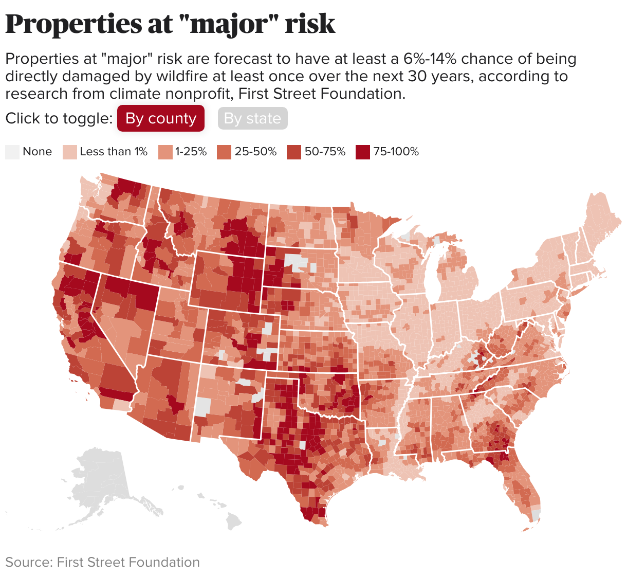 First Street Foundation 是一家气候非营利组织,负责评估全国各地地区财产被野火破坏的风险。如果预测财产在未来 30 年内至少有 6%-14% 的机会被野火直接损坏,则认为这些财产处于“重大”风险,如果可能性为 15% 或更高,则认为这些财产处于“严重”风险。